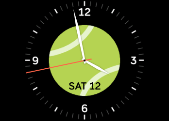A tennis-themed analog clockface. View the date, heart rate, steps, calories, distance, floors, and active minutes by tapping on the screen. Customize color of second hand and battery display. Choose to show or hide the battery and second hand.